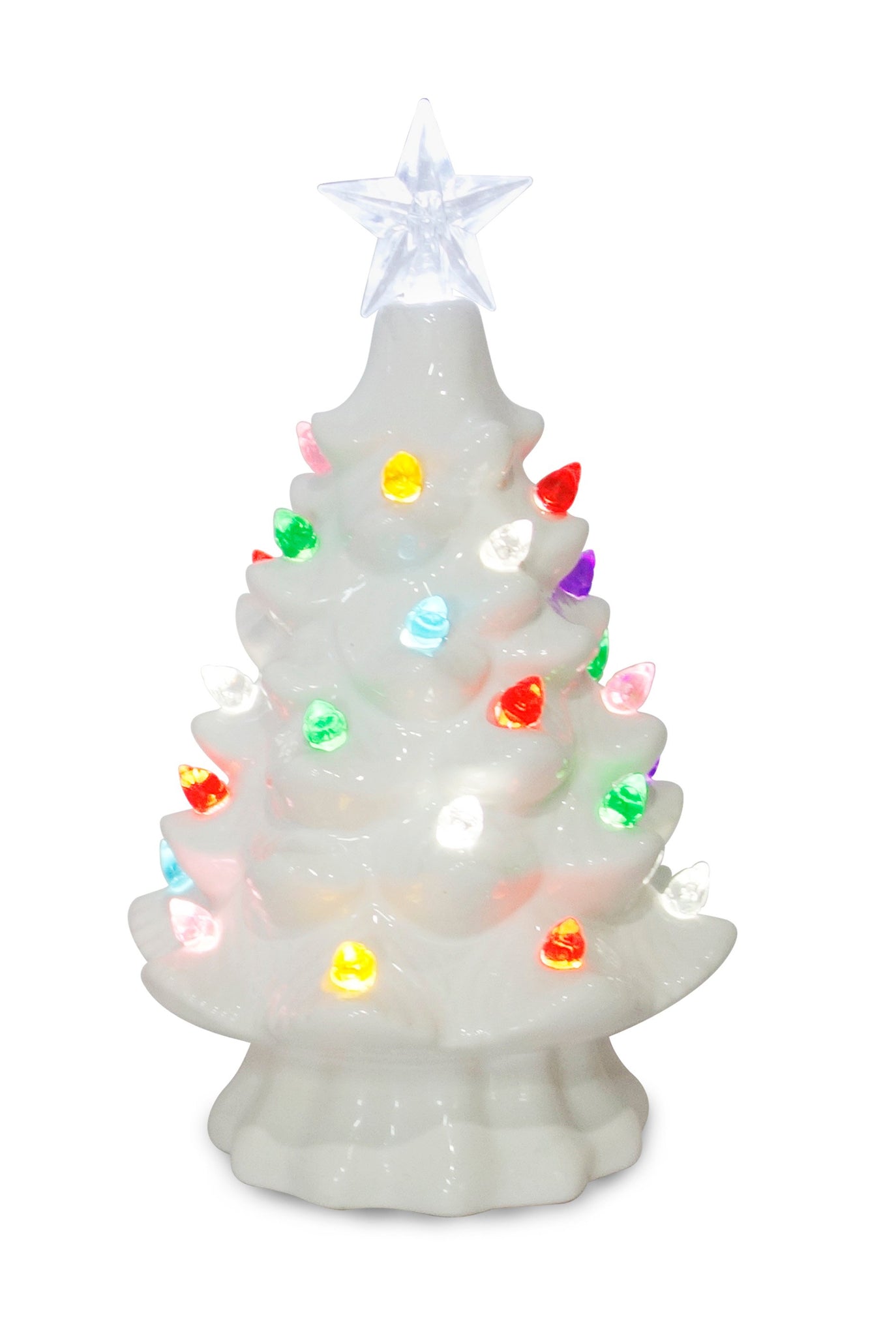 This 7.5" ceramic iridescent white tree features multicolored Christmas lights with a clear star on top.   Built in timer - 4 hours on 20 hours off.  Requires 2 AA batteries - not included.  Indoor use only.